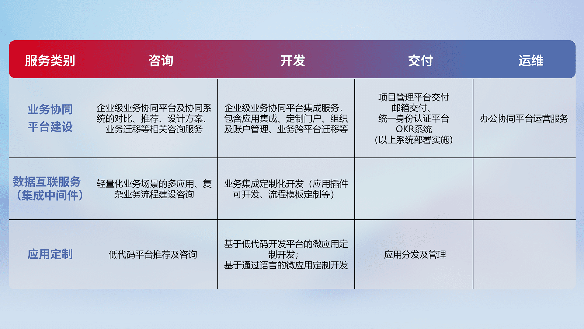 针对钉钉、、、企微、、、IDaas等平台级产品提供产品的规划、、方案、、交付、、定制化开发等服务,,,,实现如统一协同办公、、、、智能客户服务、、、、混合会议管理、、智能数据查询、、、、等业务场景,,实现数字化转型。。